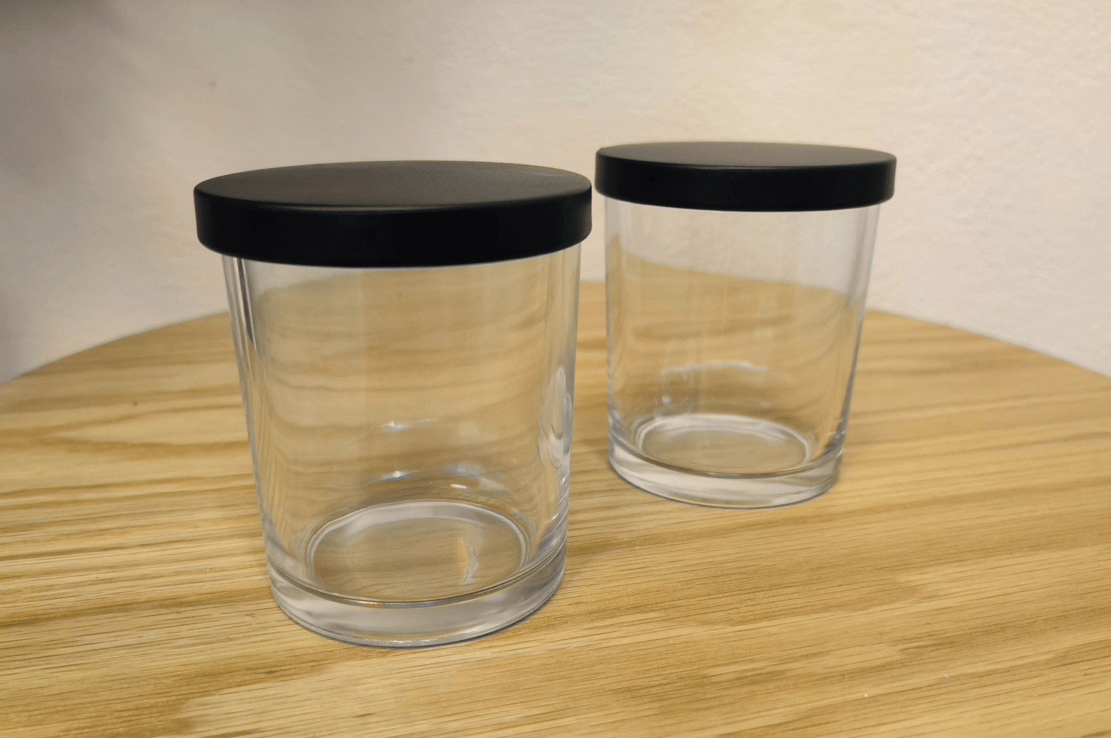Elegante frasco de vidrio transparente con tapa metálica color negro, ideal para la elaboración de velas artesanales. Su diseño minimalista permite resaltar el color y textura de la cera, aportando un toque moderno y sofisticado a cualquier colección.