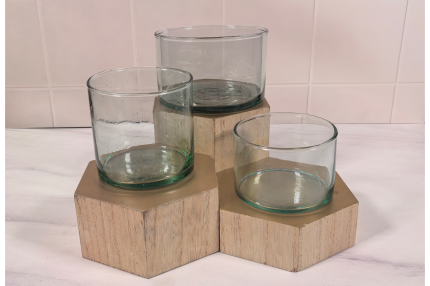 Vaso de vidrio soplado elaborado de forma artesanal, cada pieza es única y presenta ligeras variaciones en forma, textura y tonalidad que resaltan su carácter hecho a mano. Ideal para la elaboración de velas decorativas, velas aromáticas o proyectos especiales donde el diseño y la autenticidad son protagonistas.