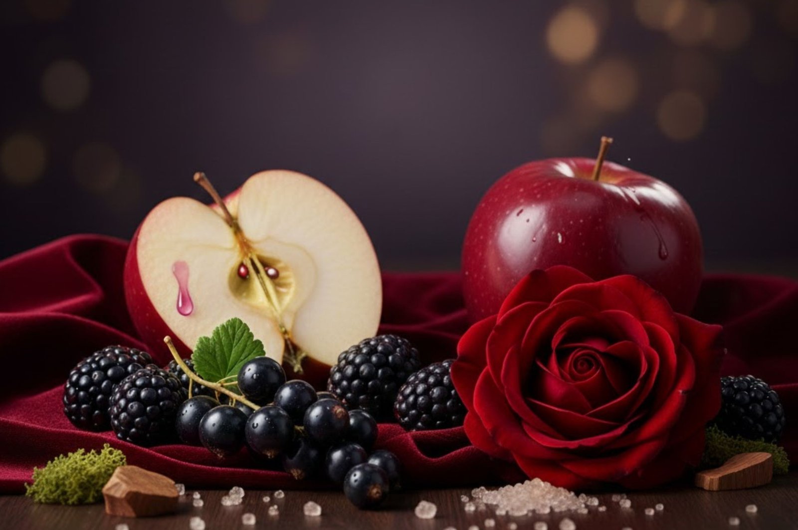 Una fragancia rica y seductora que equilibra la dulzura oscura de los frutos con una elegancia floral profunda. Inicia con la acidez vibrante de la grosella negra, realzada por el brillo chispeante del vino espumoso, creando una apertura estimulante y festiva. En el corazón, la rosa sensual florece, rodeada por la dulzura jugosa de las bayas oscuras y la manzana roja, aportando una riqueza embriagadora. Finalmente, una base de sándalo cremoso, musgo terroso y azúcar suave proporciona una estela cálida, profunda y deliciosamente adictiva.